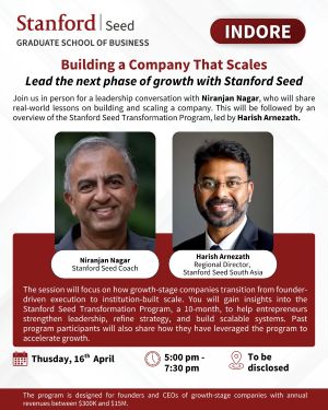 Indore, 2026: The Stanford Graduate School of Business, through its Stanford Seed initiative, will host a high-impact leadership session titled “Building a Company That Scales” in Indore on April 16 from 5:00 pm to 7:30 pm. The session is designed to support founders and CEOs of growth-stage companies as they transition from founder-led operations to institutionally scalable enterprises.